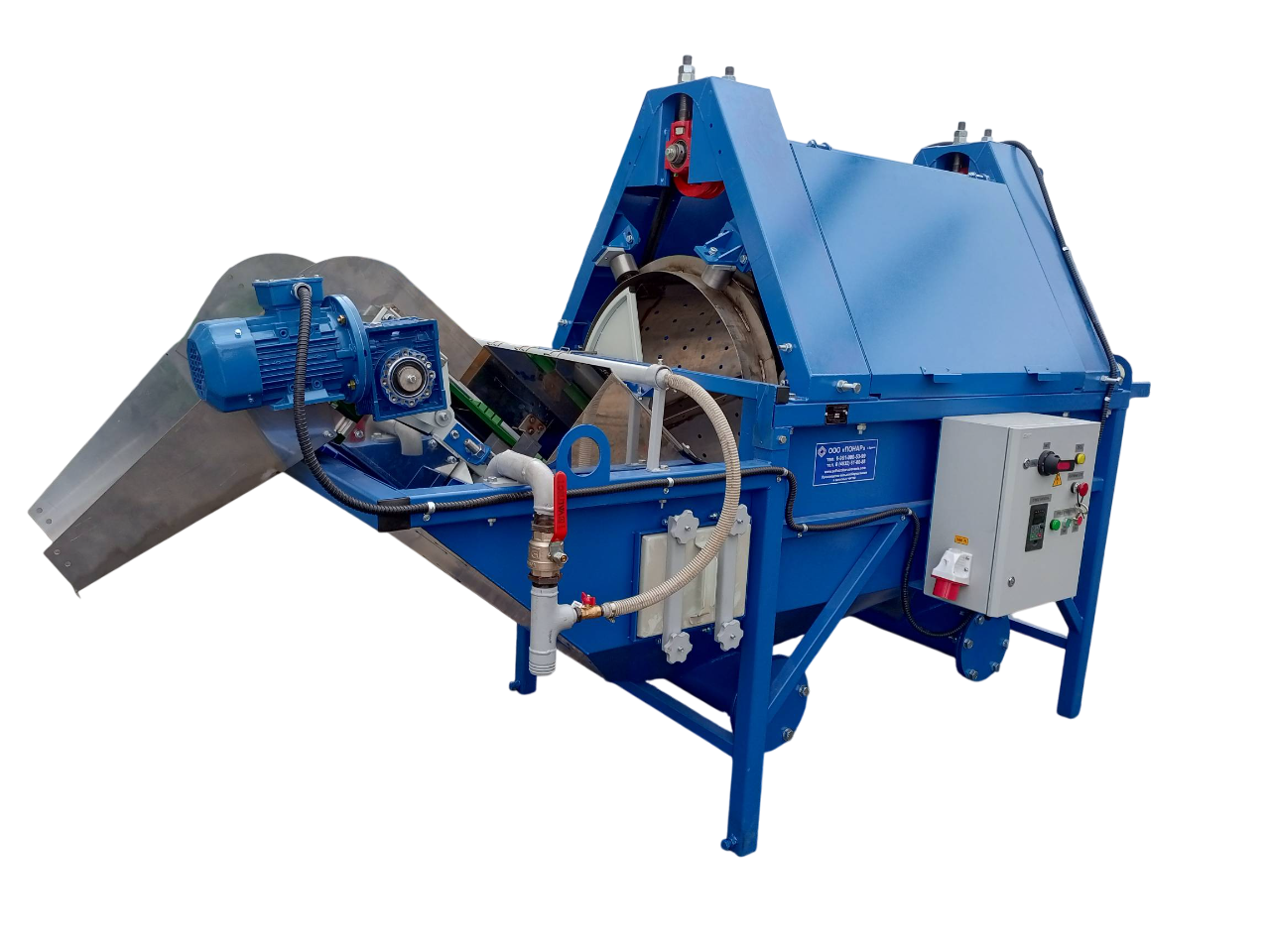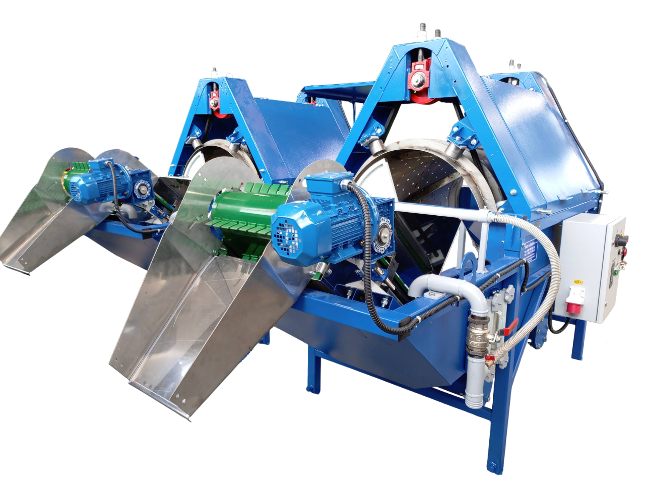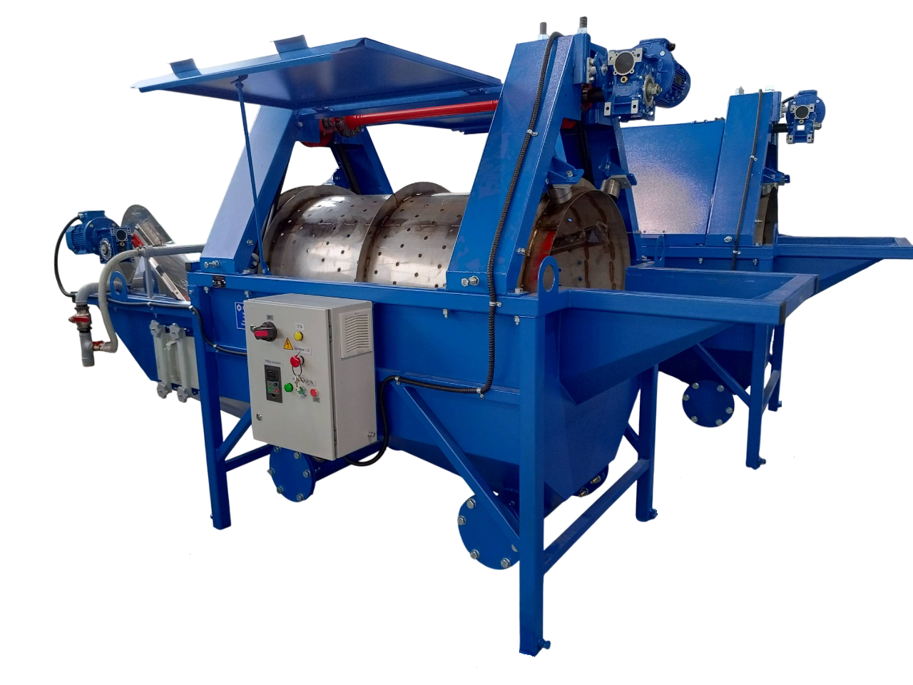 Конструкция выполнена в виде вращающегося барабана с направляющими внутри лопатками. Очистка осуществляется при помощи воды и трения корнеплодов при движении к выгрузному транспортеру, для регулировки объема продукта на выходе используется заслонка. Над выгрузным транспортером находятся форсунки которые дополнительно омывают овощи при выходе из мойки. Отвод загрязнений производится с помощью ручных задвижек по мере загрязнения либо комплектуется пневмозадвижками работающими в автоматическом режиме. Полный слив воды из емкости выполняется после остановки комплекса или при сильном загрязнении.